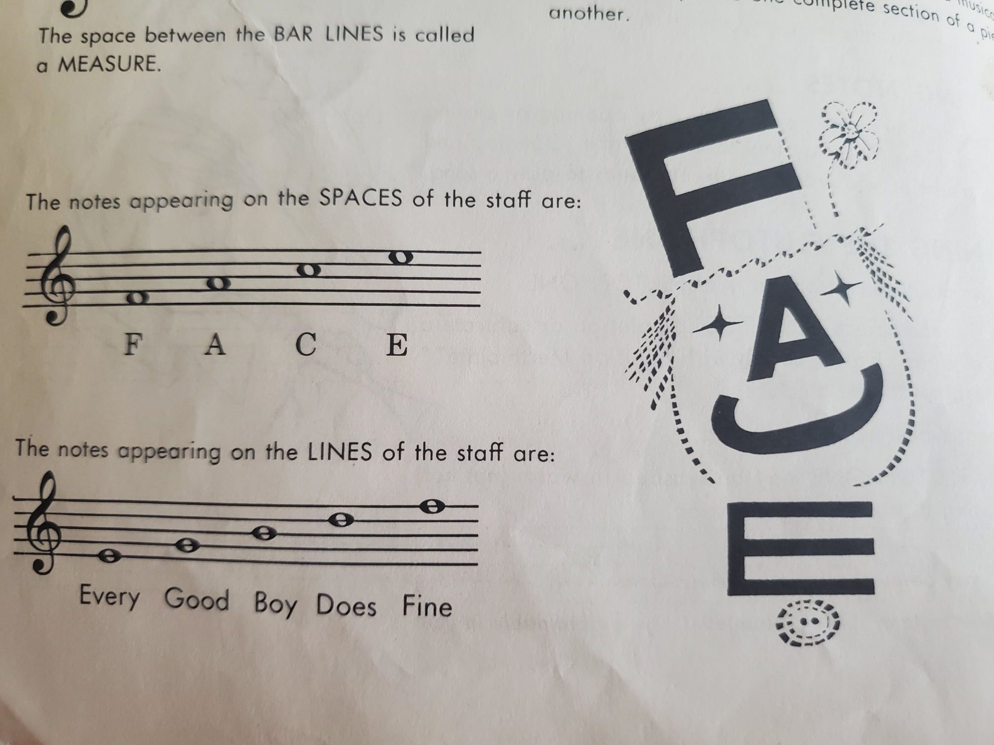 It was only years later that I realized why I resorted to writing the letters of the notes under the music notion instead of reading… a confusing illustration at the beginning of the book was part of the problem. Do you see how compared to the note reading chart to the left, the image spells “F A C E” UPSIDE DOWN?!? If only I had Miss Val’s Music Magic then!